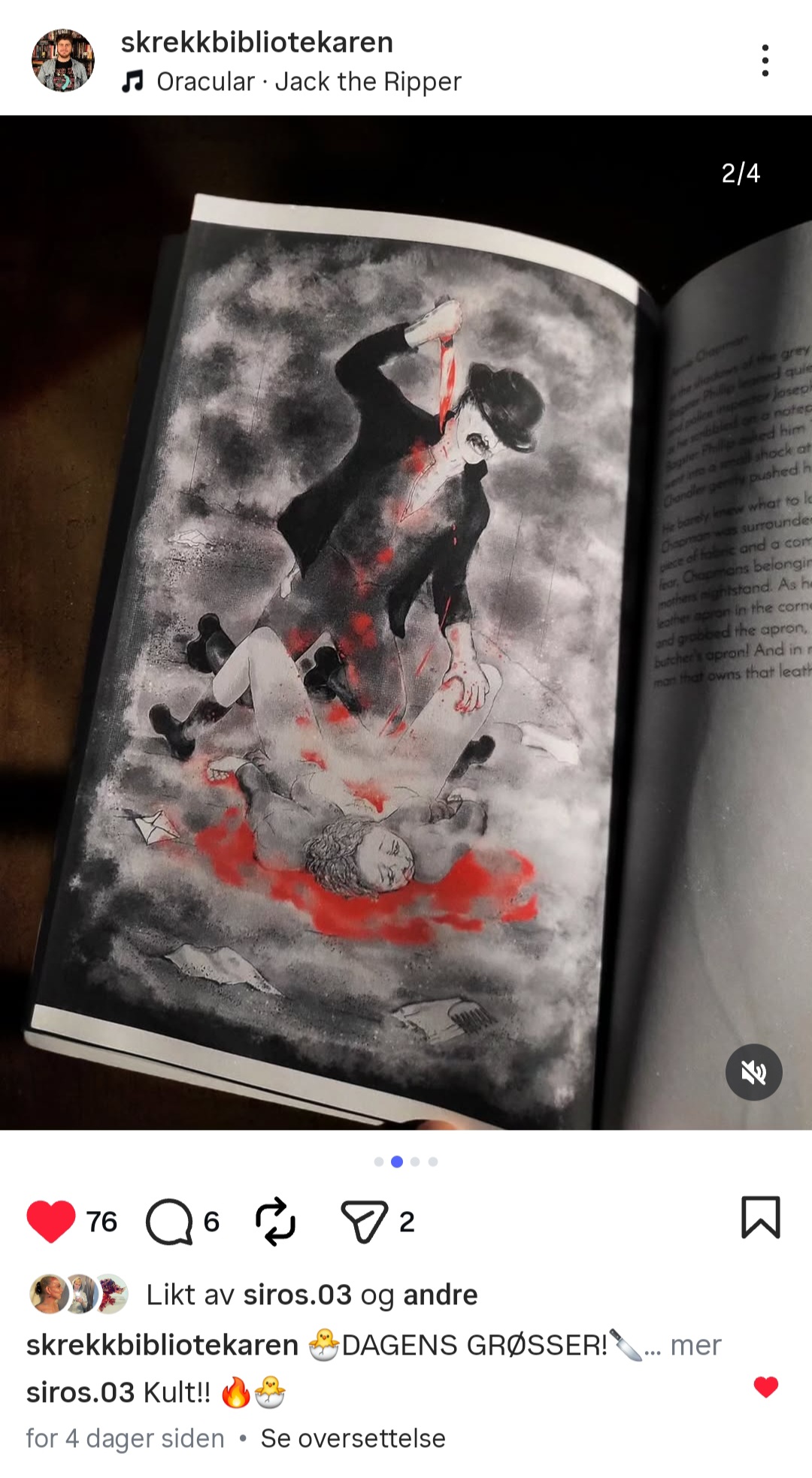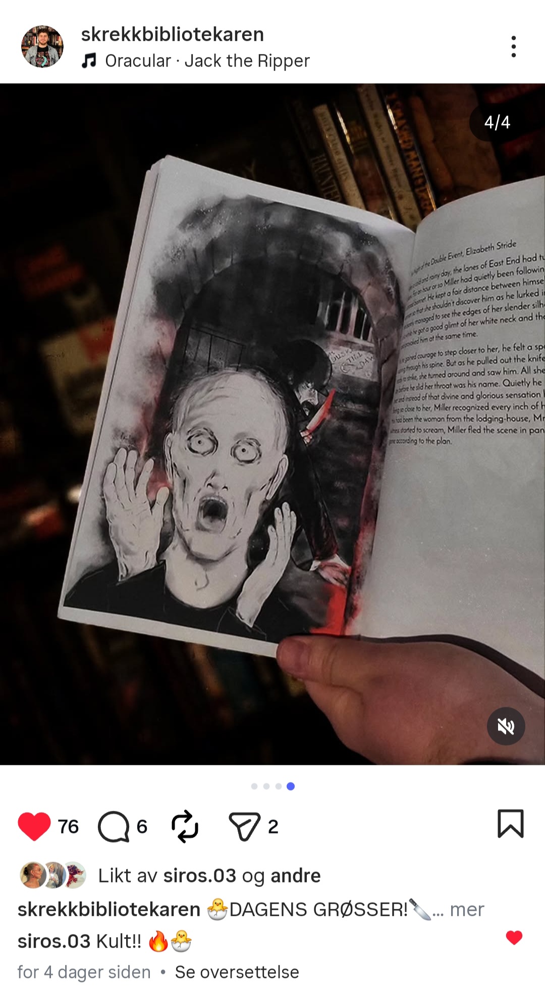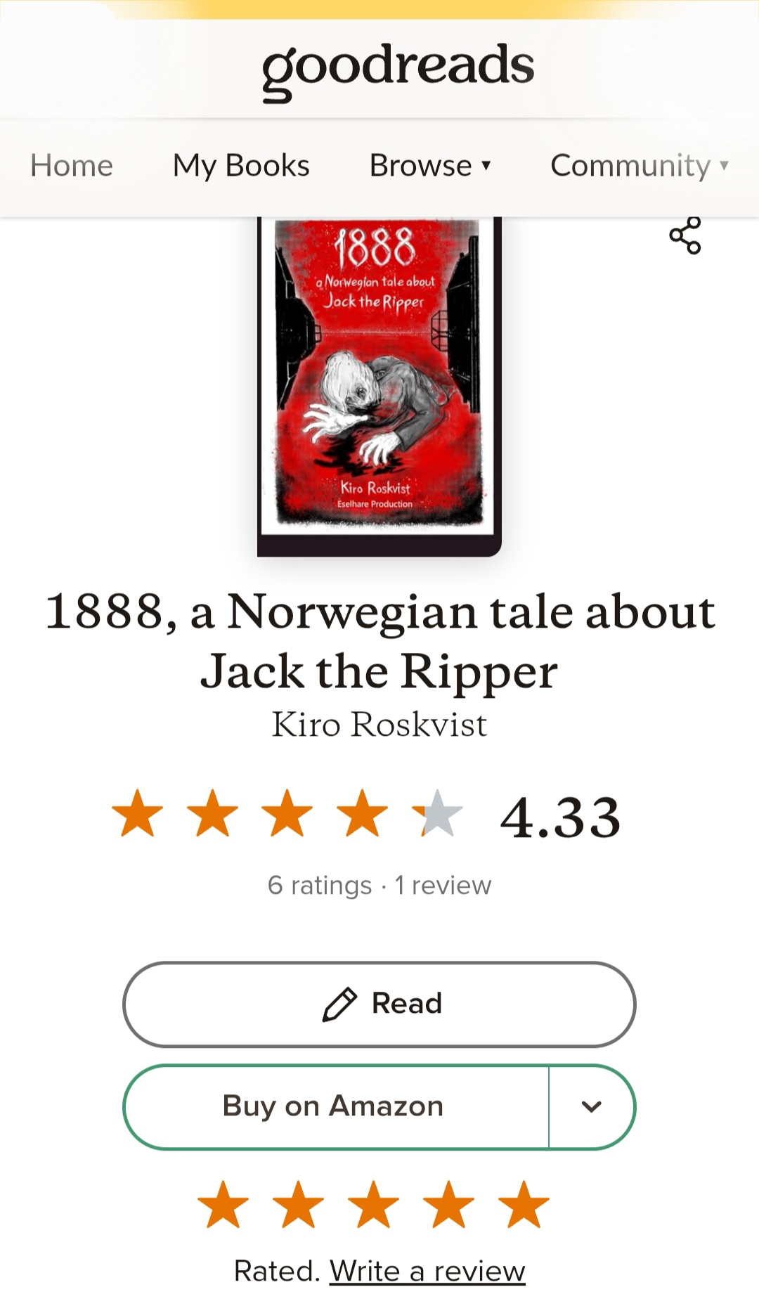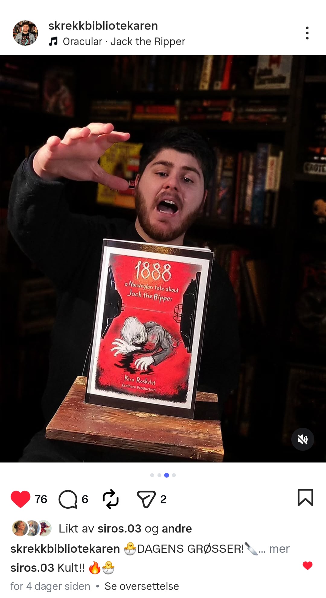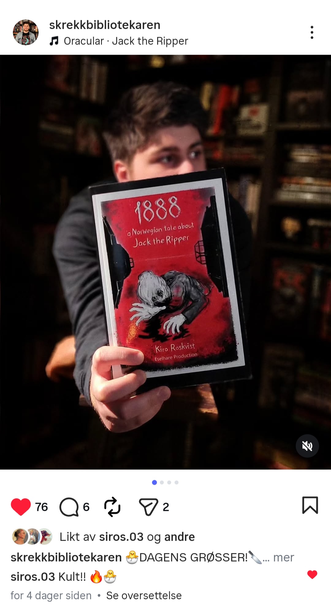 I would like to thank The Horror Librarian for a wonderful 4/5-stars-book-review about 1888, a Norwegian tale about Jack the Ripper! The review is available on Instagram and Goodreads: https://www.instagram.com/skrekkbibliotekaren/ https://www.goodreads.com/user/show/106755159-skrekkbibliotekaren