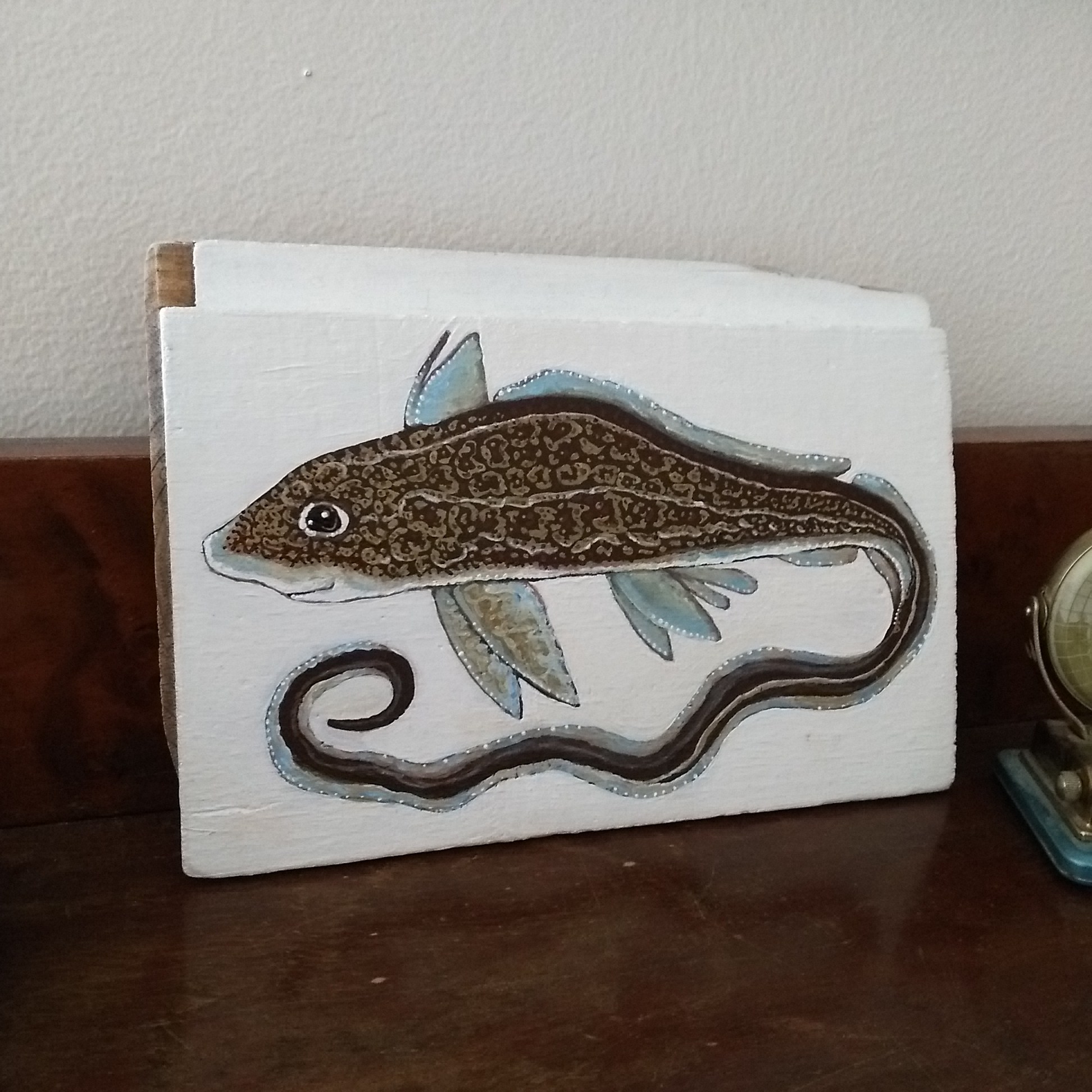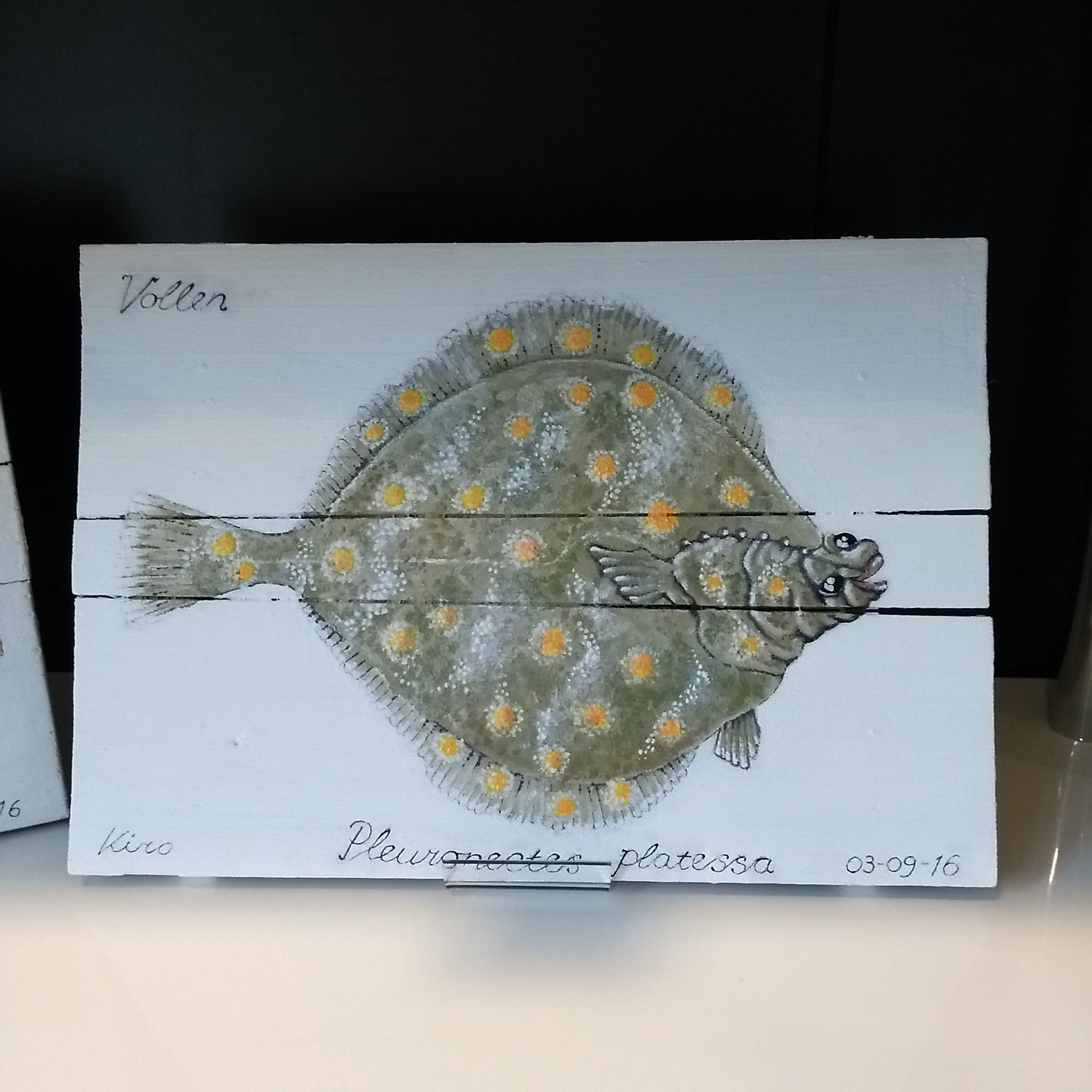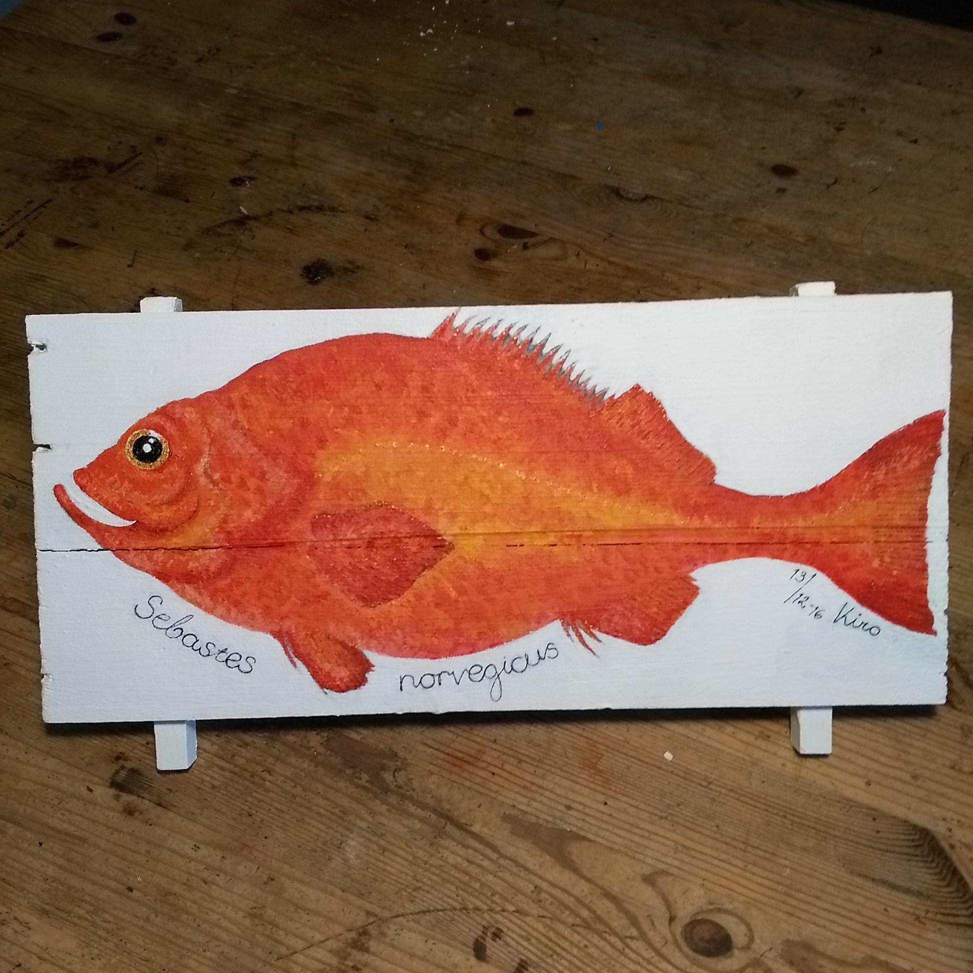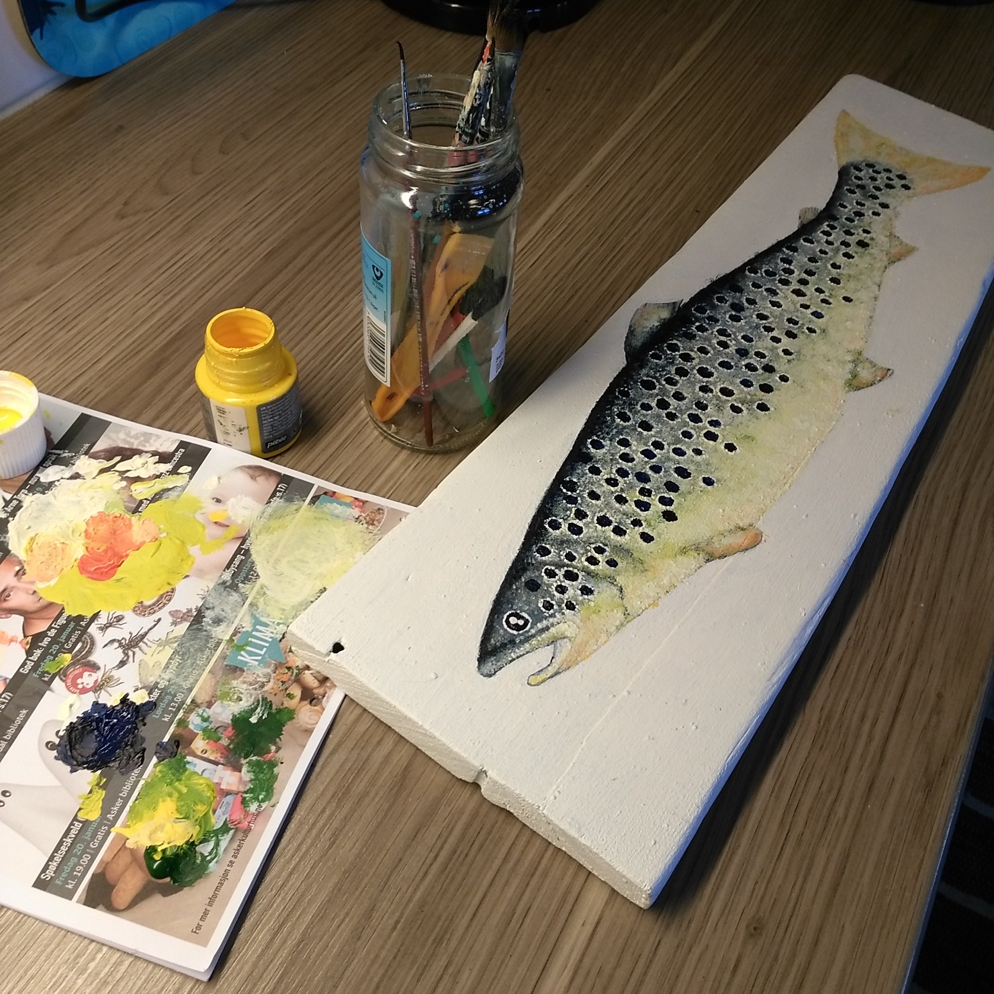 Et utvalg av akrylmalerier malt på drivved fra Oslofjorden. Samtlige malerier er solgt.